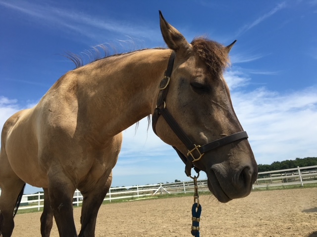 Zach is a 2000 Quarab gelding. Zach is a great intermediate lesson horse. He is more forward moving than our beginner horses but pretty reliable otherwise. He is the go-to for teaching kids to jump for the first time and happily totes kids around at dressage shows as well!